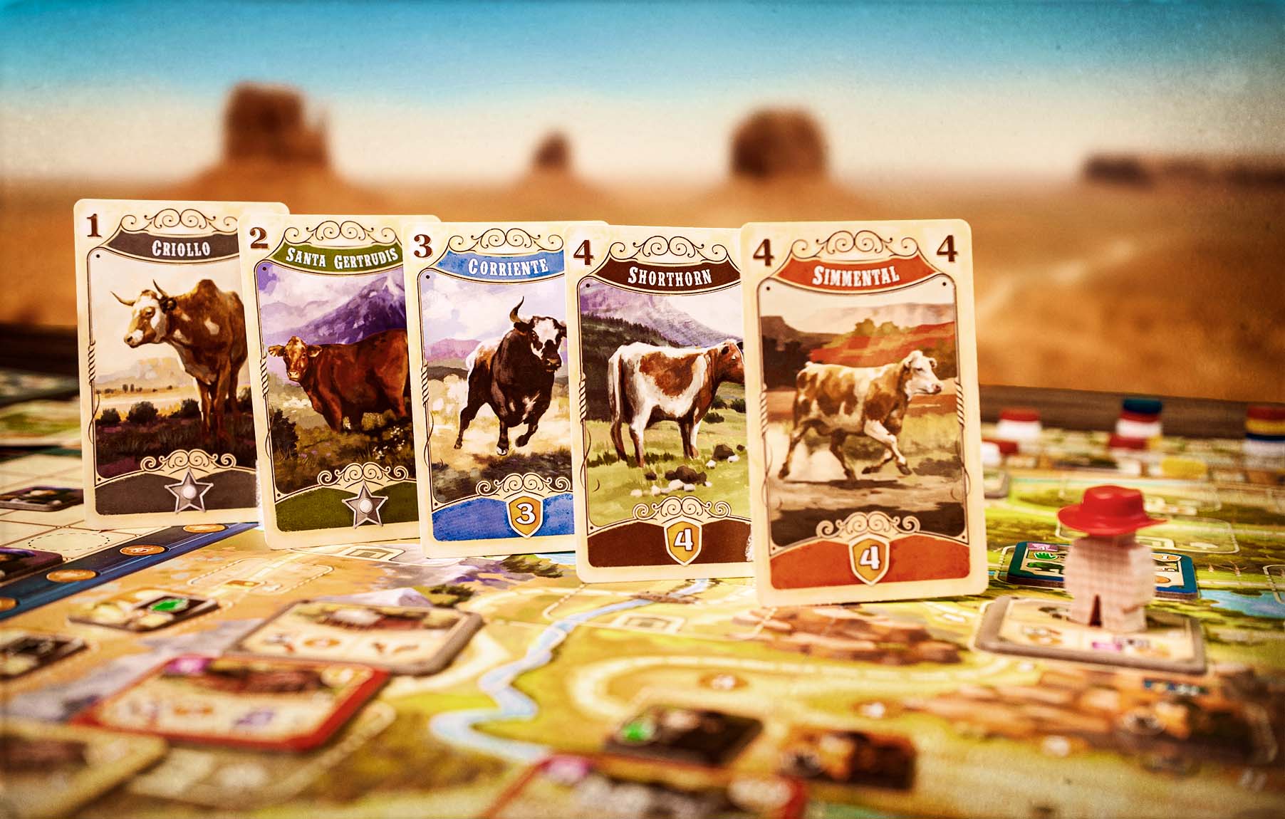 Your initial cattle deck starts with the same 14 cows with zero victory points, indicated by stars in your color on the bottom of the cards. Draw the top 4 cards (up to 6 if you’ve upgraded your hand size) and herd those cattle along the trail! As you earn money, you’ll be able to add to your cattle herd with more valuable cows, both in terms of breeding values and end-game victory points. You’ll want a diverse herd. You can only sell unique cows in Kansas City, so along the trail, you’ll want to take actions to diversify and upgrade your cattle.