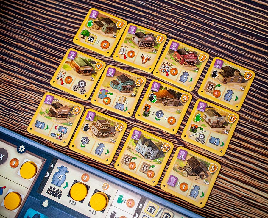 There are twelve building tiles in the game. Below is the A-side; flip them over for 12 new buildings with the B side. All players must be playing with the same set of buildings, so if you randomize them, make sure everyone is playing each card on the same a/b side. You’ll notice the most expensive card takes 12 workers to place, worth 20 victory points. With only six builders you can hire, you’ll have to upgrade your buildings to reach this desirable building.