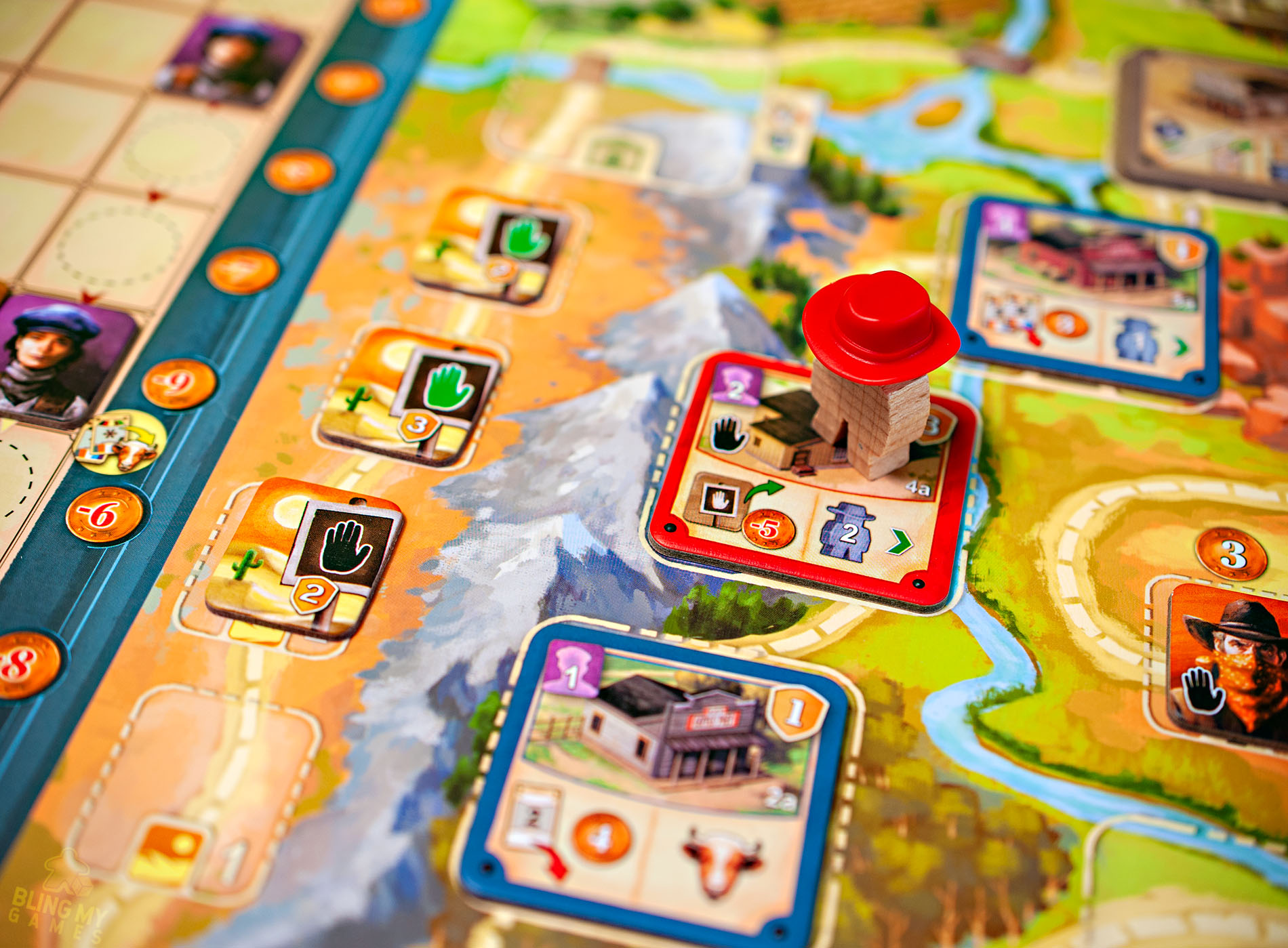 Beware, there are many pitfalls along the trail! You may encounter drought, floods or rockslides! Each Hazard will take a few bucks to get you out safely. And woe to the rancher that goes through this canyon of Outlaws below! Each one would steal more money from you! Luckily, there are ways in the game to remove Hazards for end-game victory points and turn in Outlaws for cash.