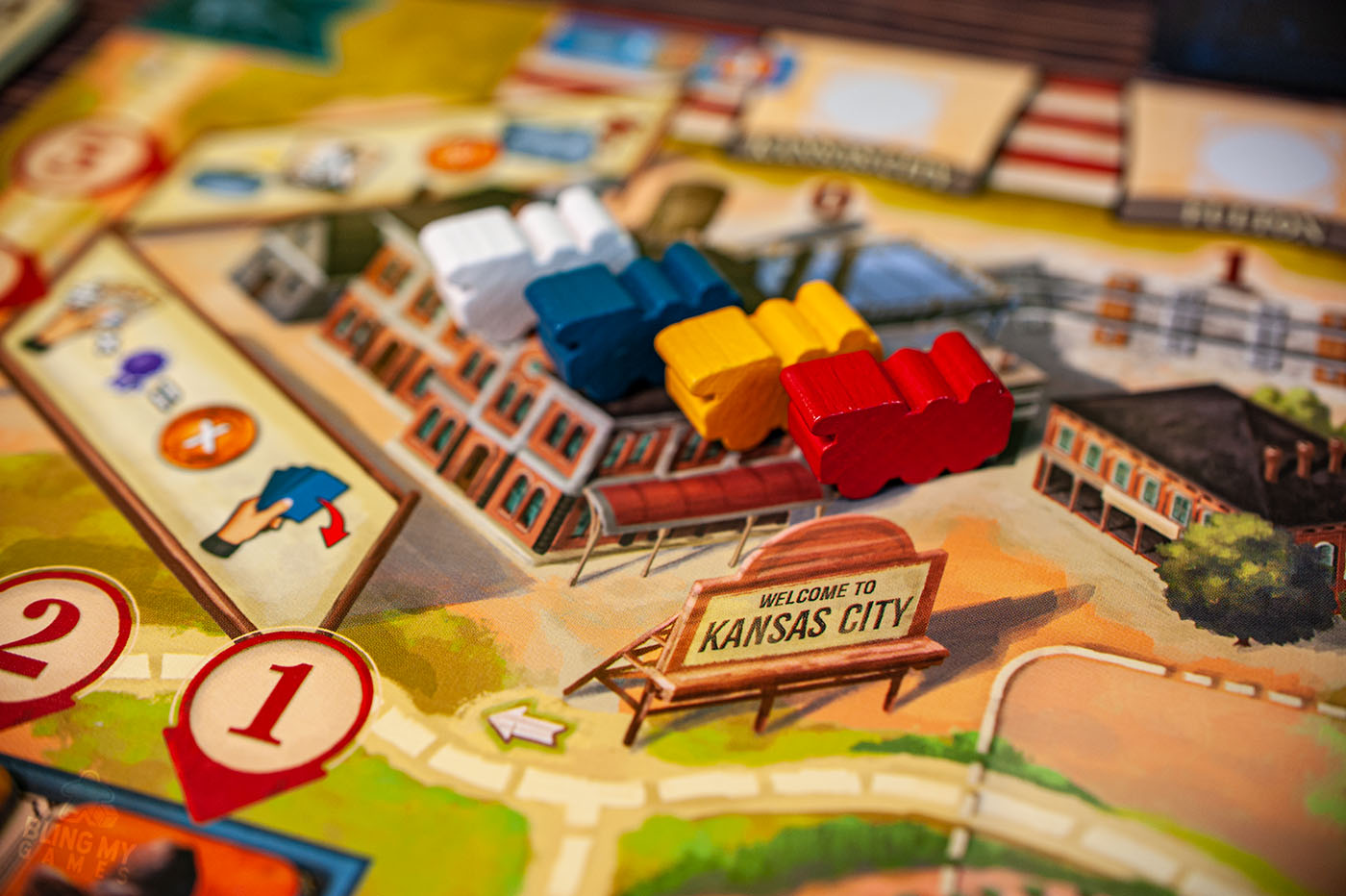 After much hard work on the Great Western Trail, you’ll finally reach Kansas City! You’ll take five actions here, including adding new Hazard/Outlaws/Workers to the board, selling your herd and gaining money, and paying any train station fees. Then it’s back to Texas to start all over again!