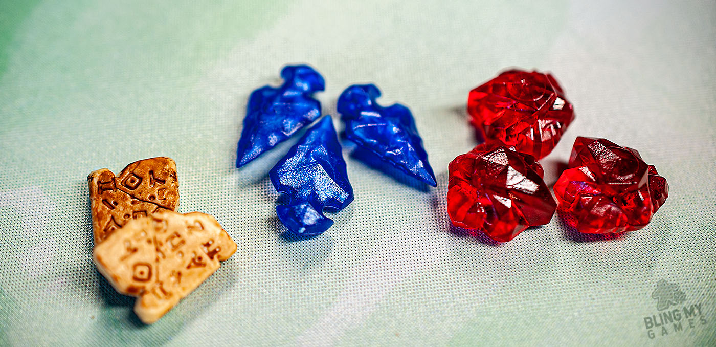 This game has lovely production quality, with three plastic resources in unique shapes – tablets, blue arrowheads and red gems. I did use a wash over the tablets to make them look more weathered. I also substituted the cardboard money for gold metal coins about the same size.